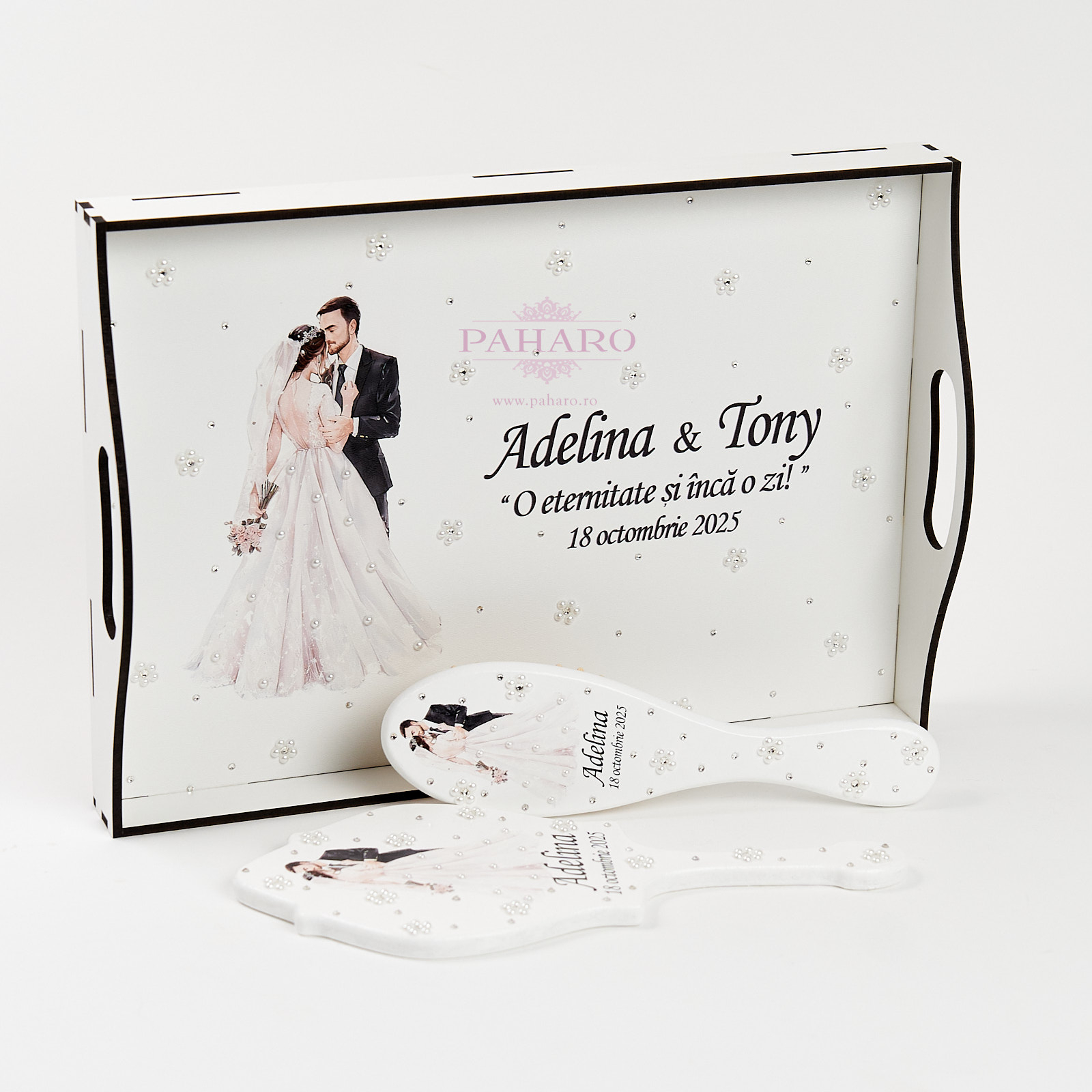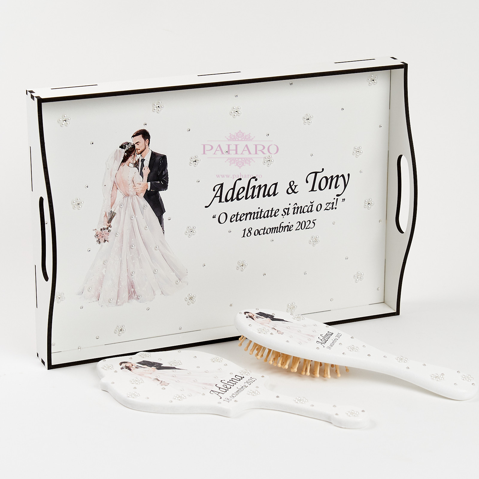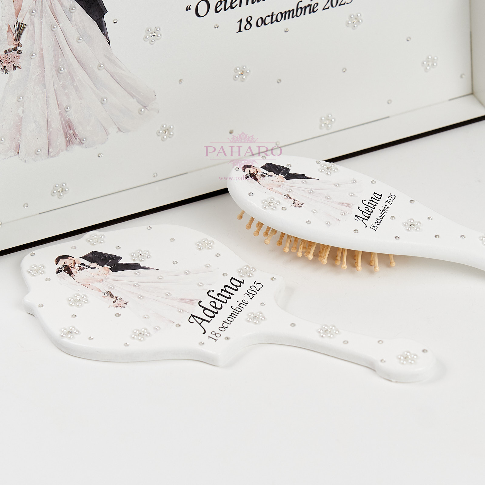 Set personalizat compus din tavă ,perie și oglindă, perfect pentru ziua nunții voastre. Cu un design delicat și o ilustrație tematică, pentru momentele de la pregatirea miresei.