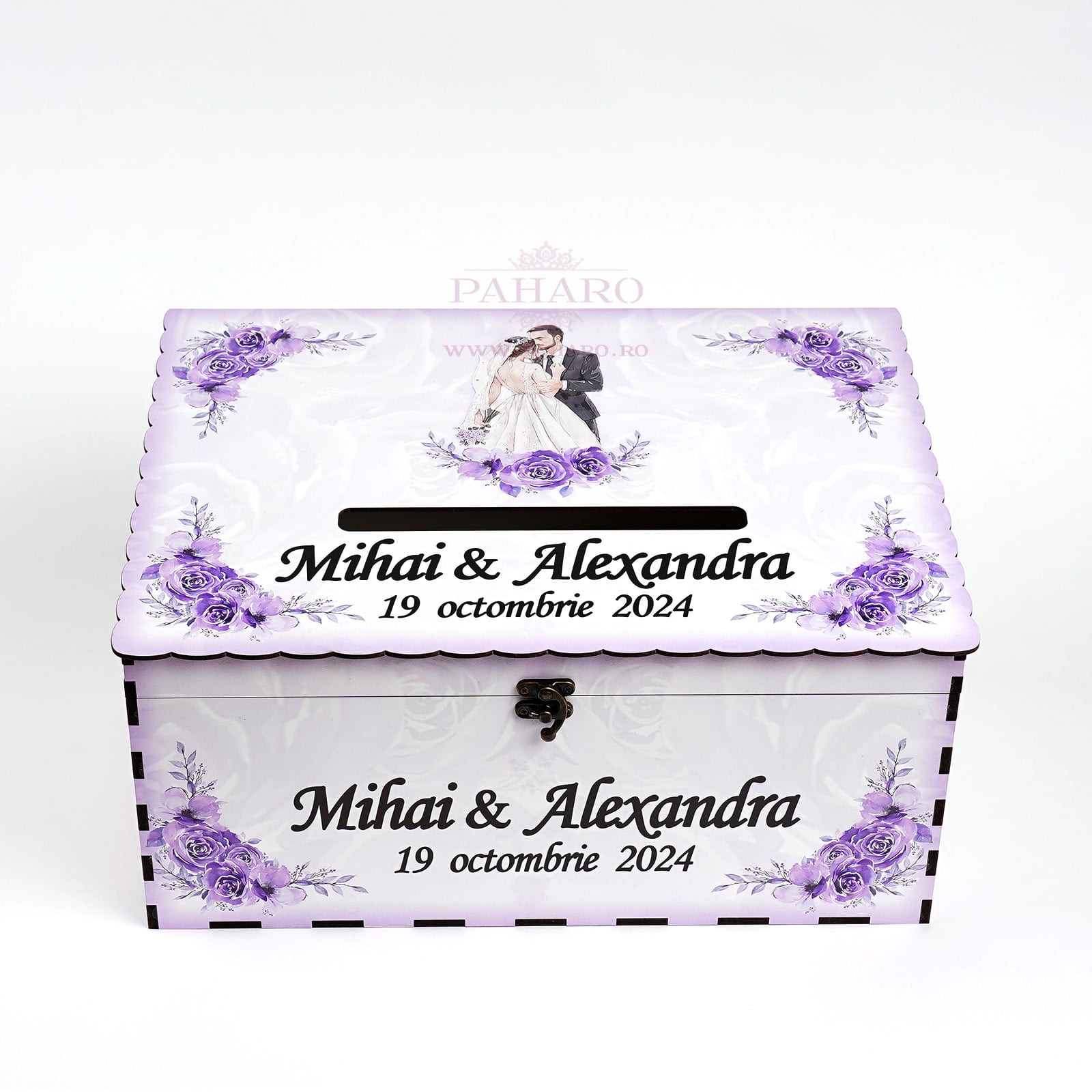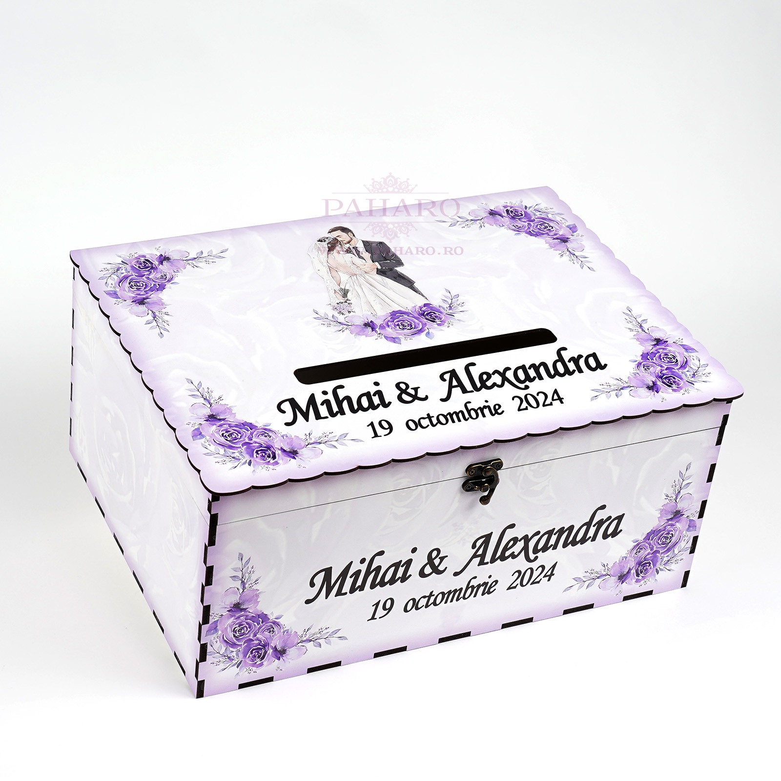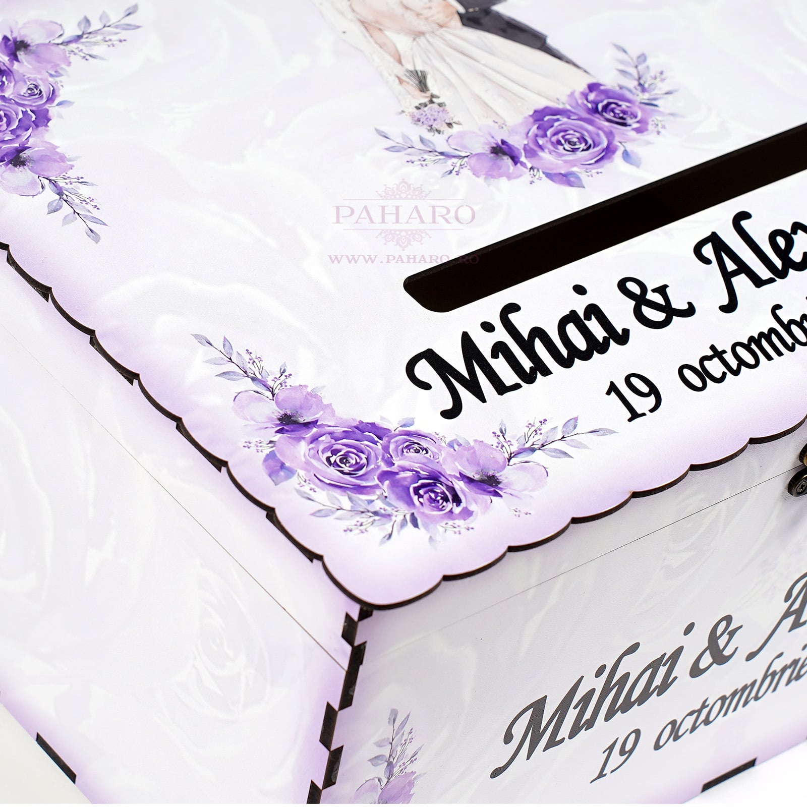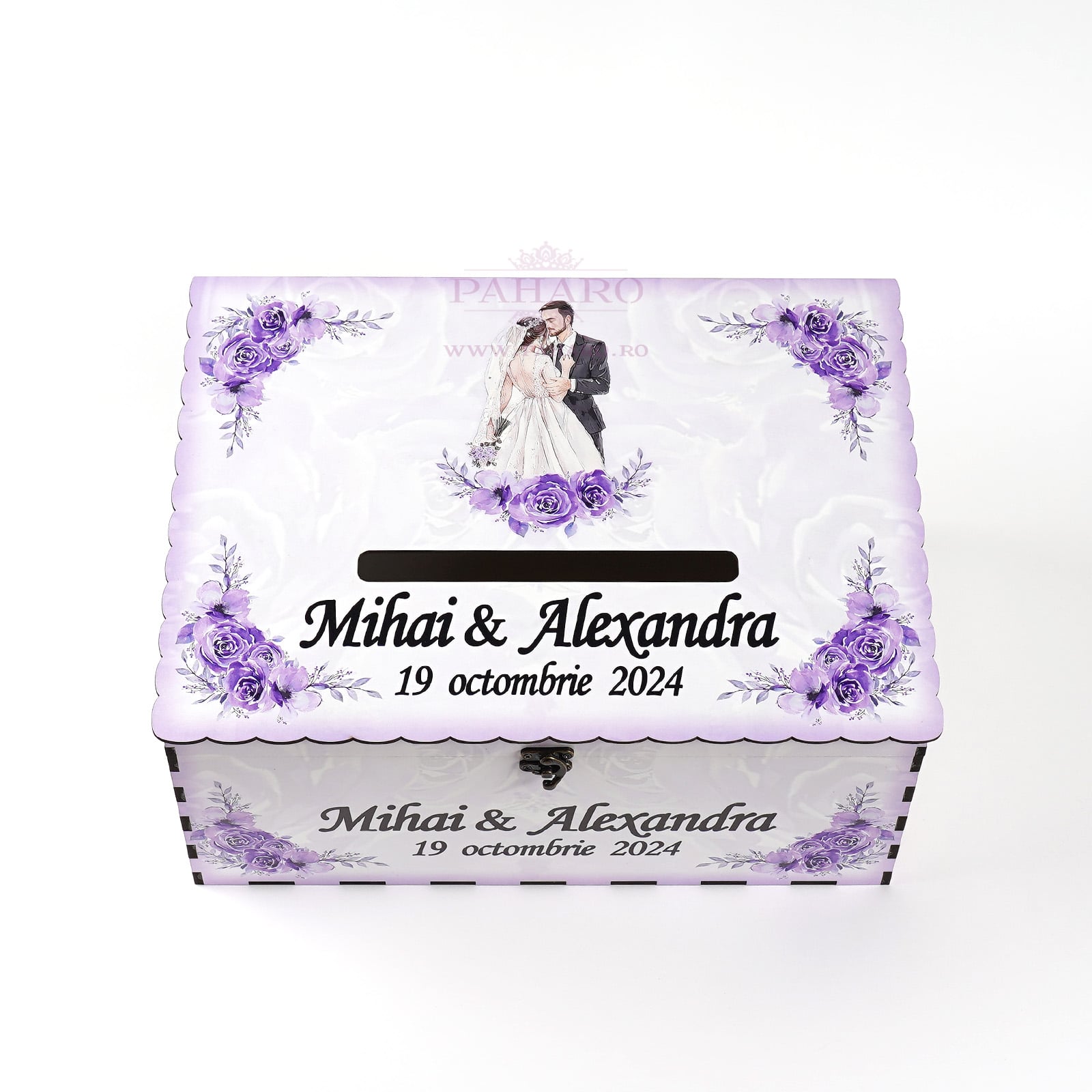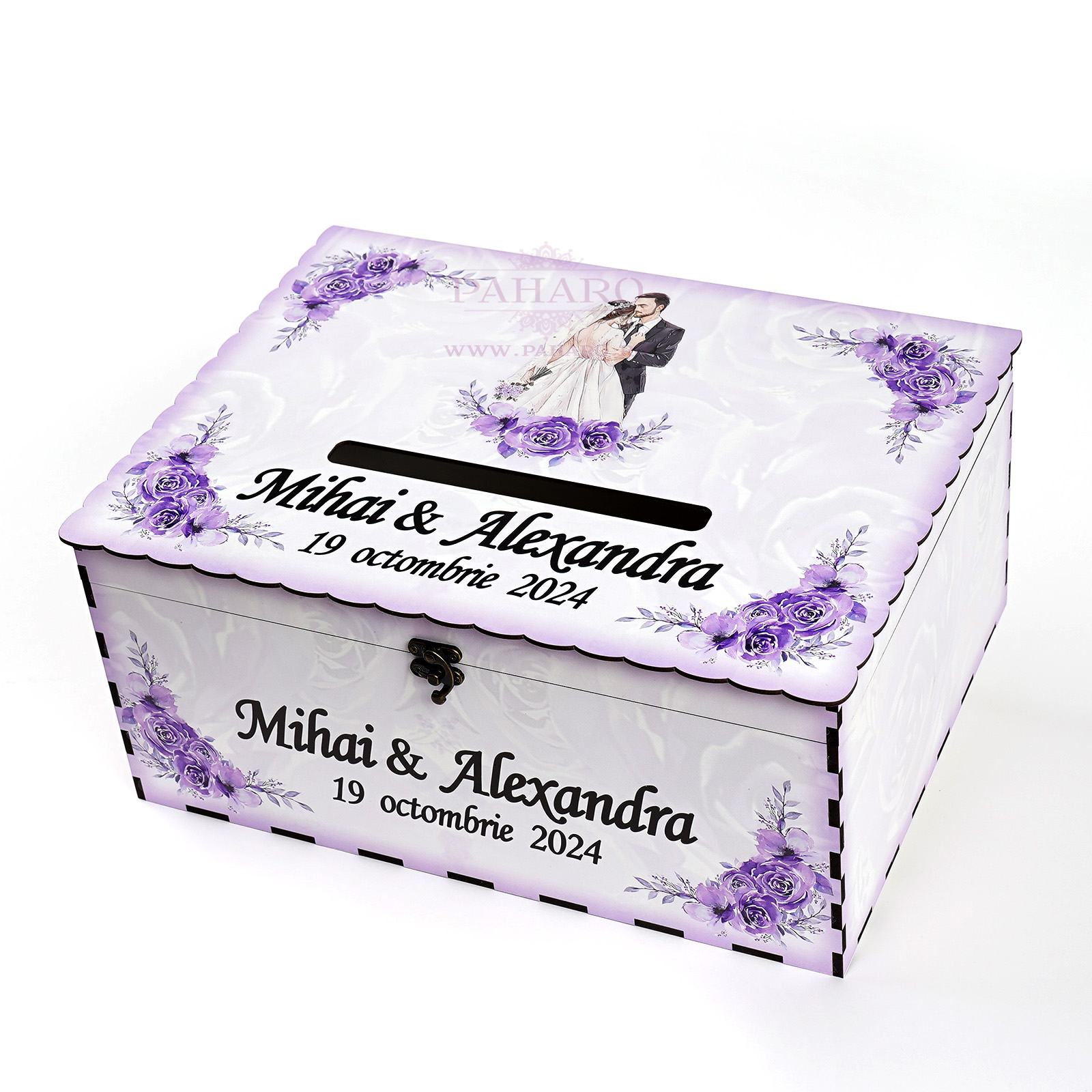 Cufăr sau cutie pentru daruri – un accesoriu elegant și personalizat, perfect pentru a colecta darurile de la invitați în ziua nunții voastre. Cu un design floral delicat și o ilustrație romantică a mirilor, acest cufăr nu este doar practic, ci și un suvenir de neuitat pentru o ocazie atât de specială.
