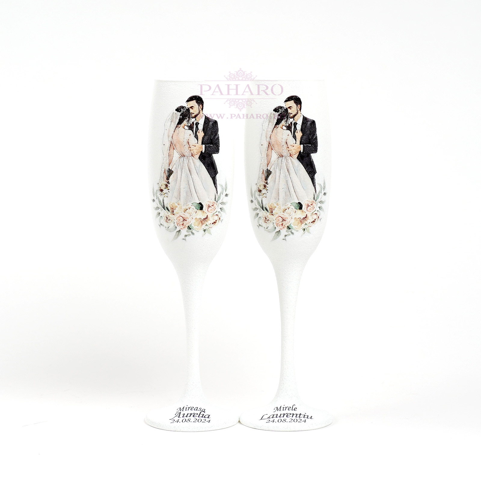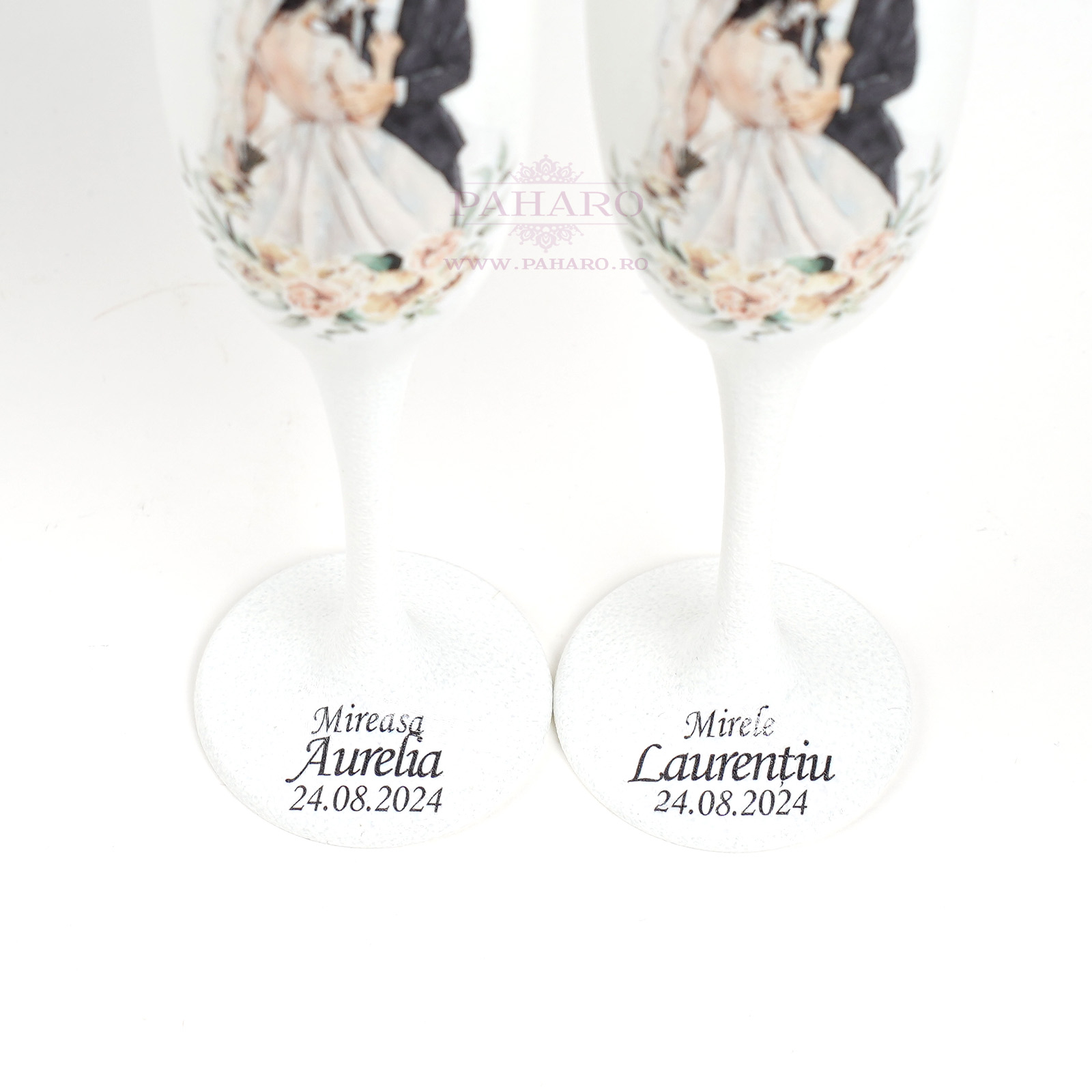 Numele mirilor și data nunții sunt inscripționate la baza fiecărui pahar, adăugând o notă unică și sentimentală.