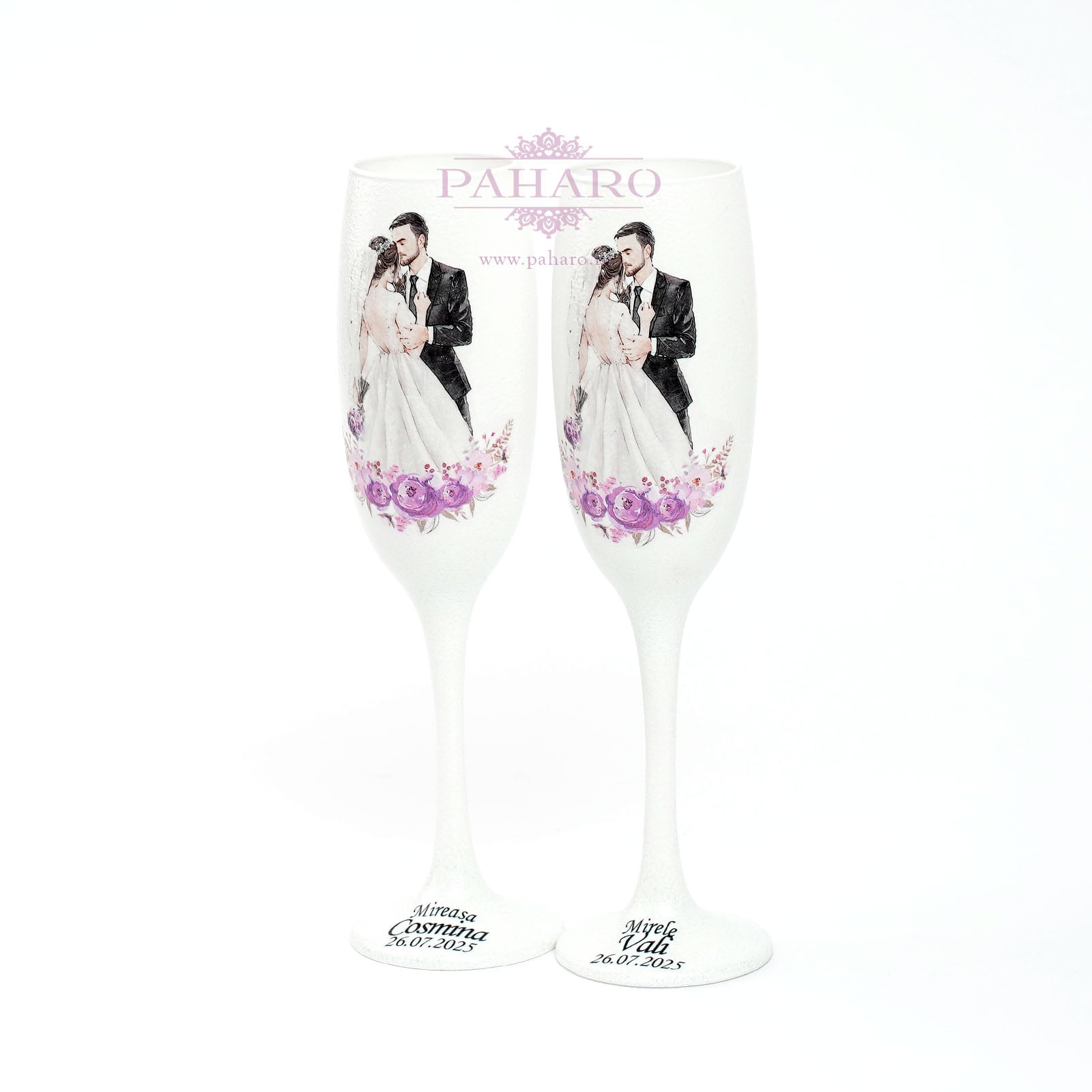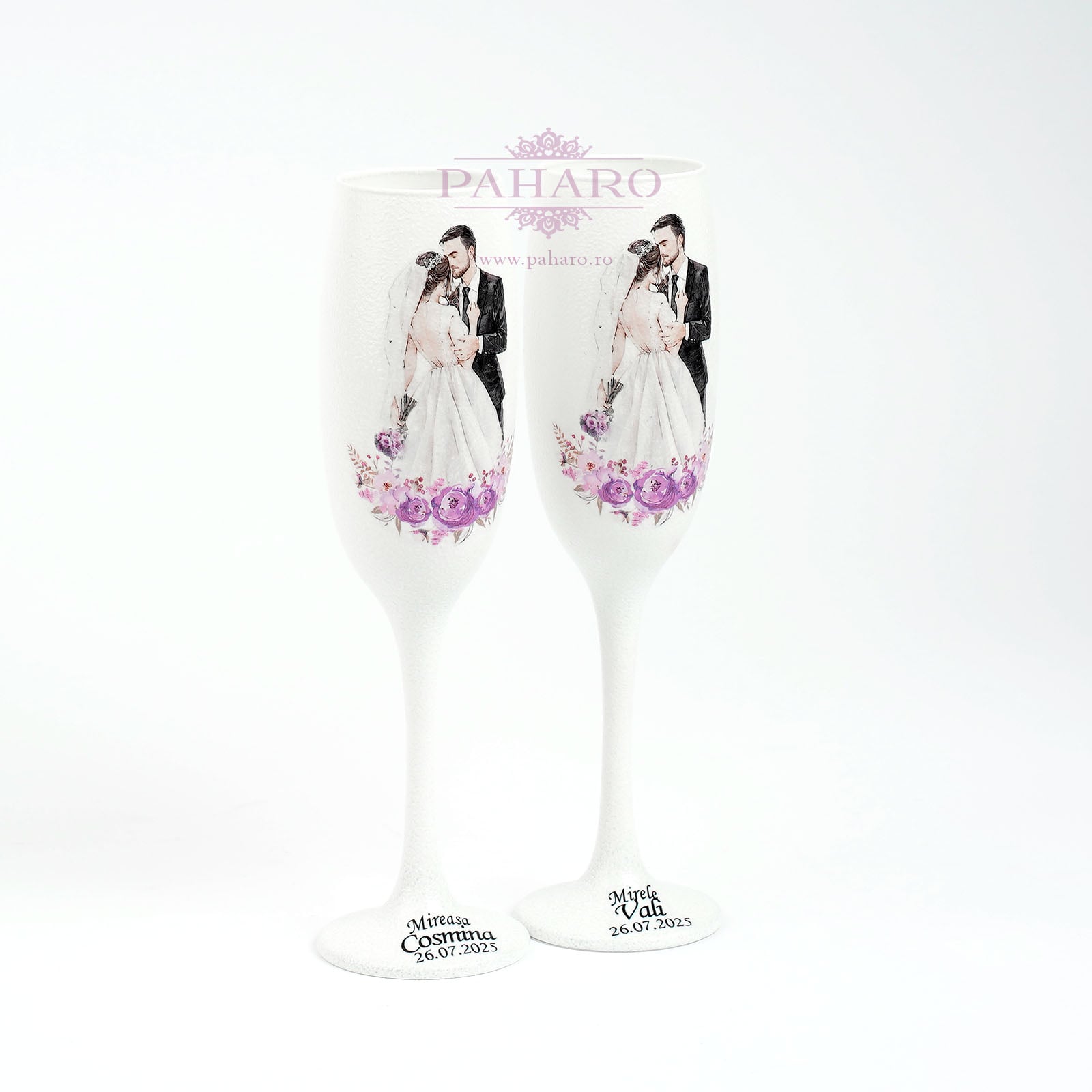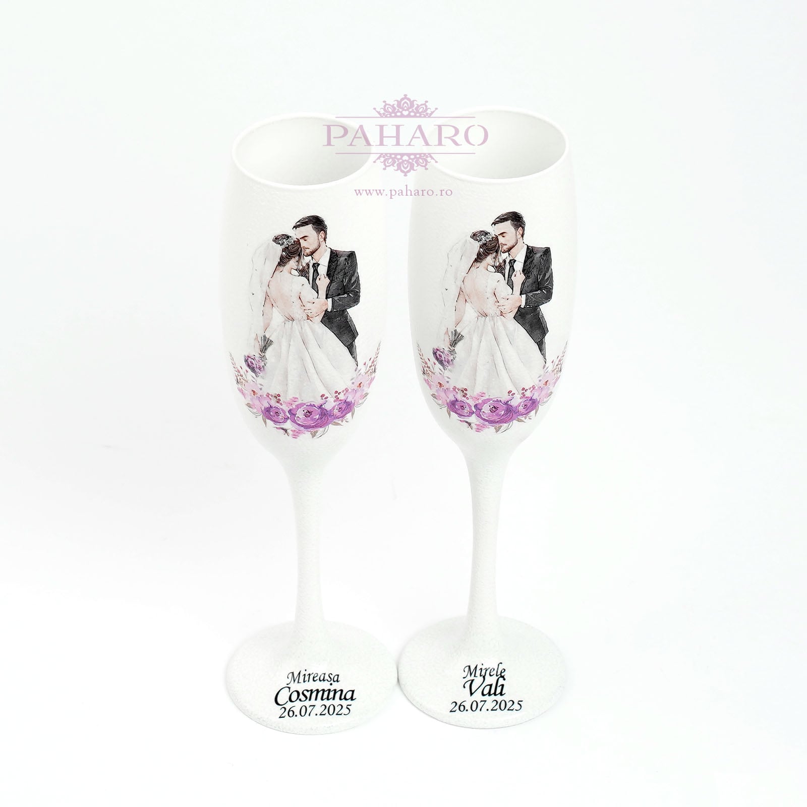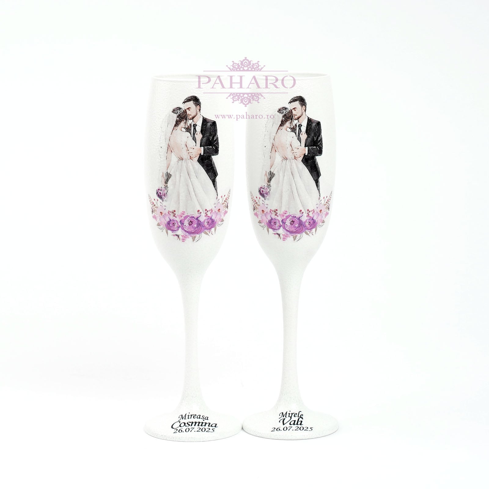Numele mirilor și data nunții sunt inscripționate la baza fiecărui pahar, adăugând o notă unică și sentimentală.