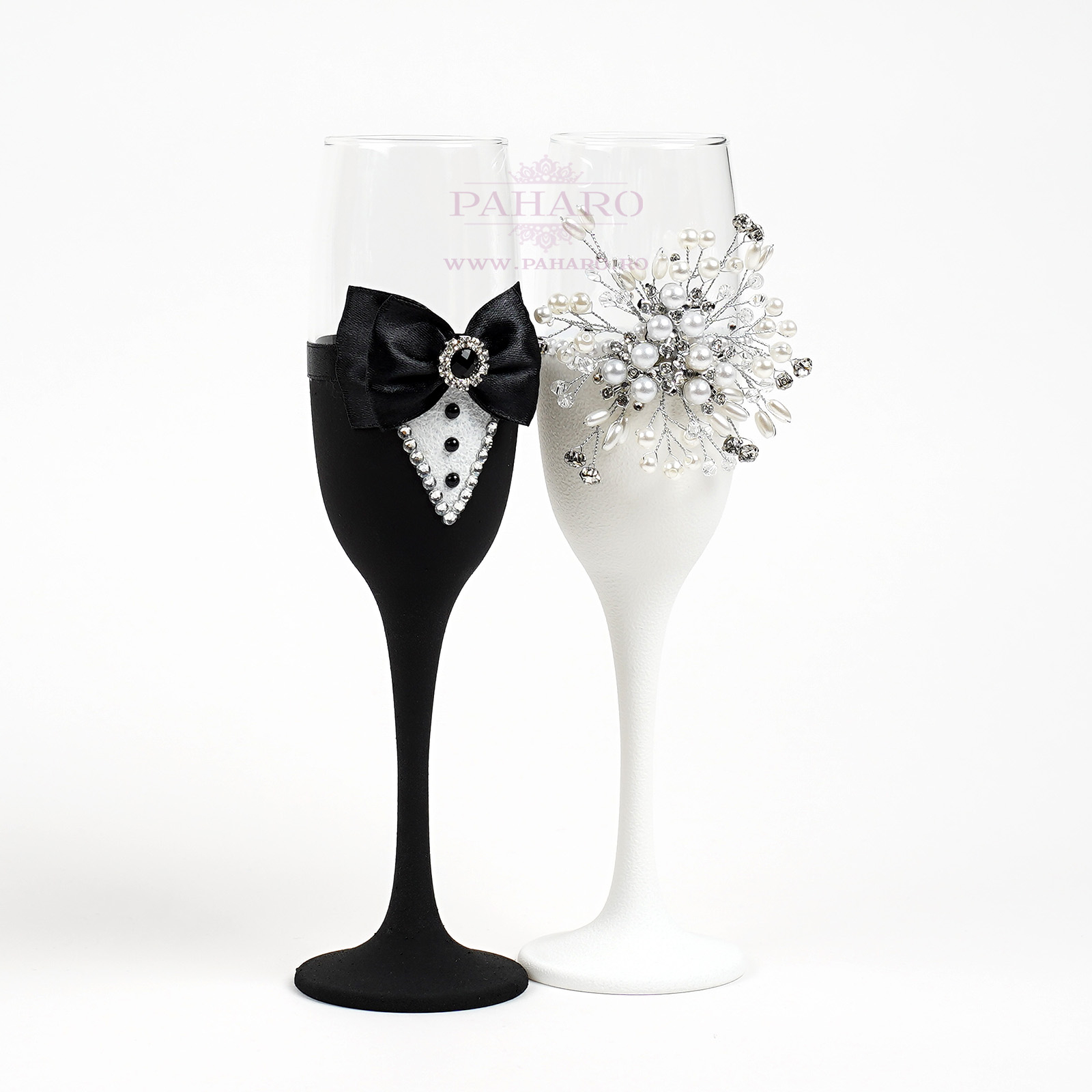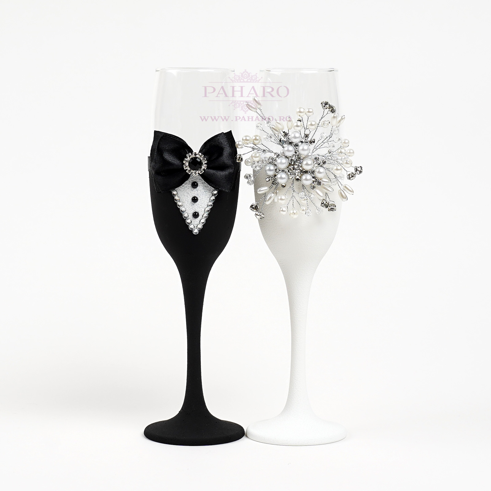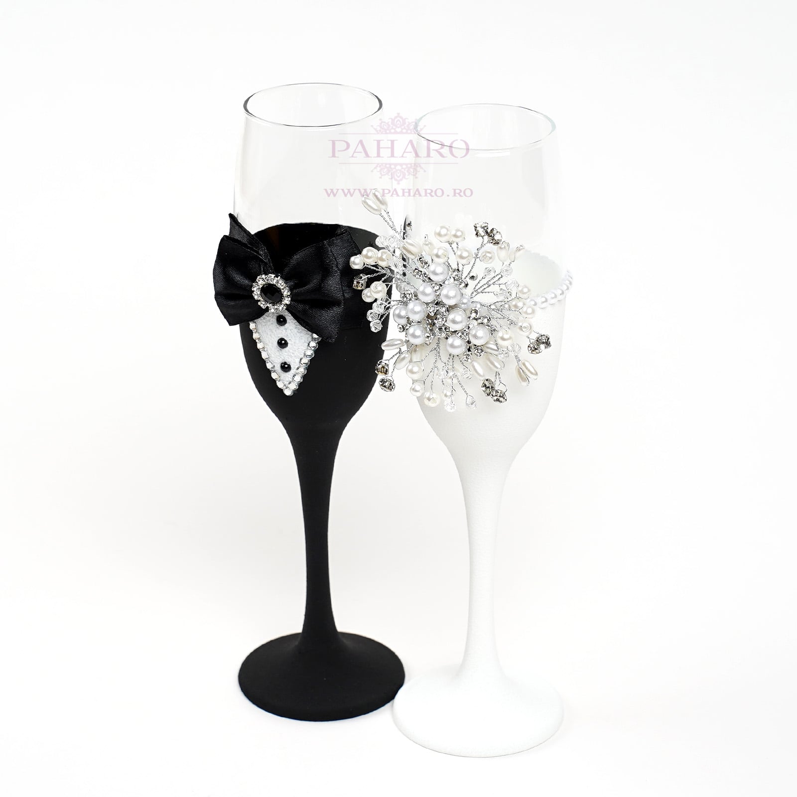Paharul pentru domni: vopsit în negru mat, acest pahar evocă rafinamentul unui smoching clasic. Decorat cu un papion negru din satin și detalii din perle și cristale în formă de cămașă, acesta este perfect pentru a reprezenta eleganța masculină în ziua evenimentului.