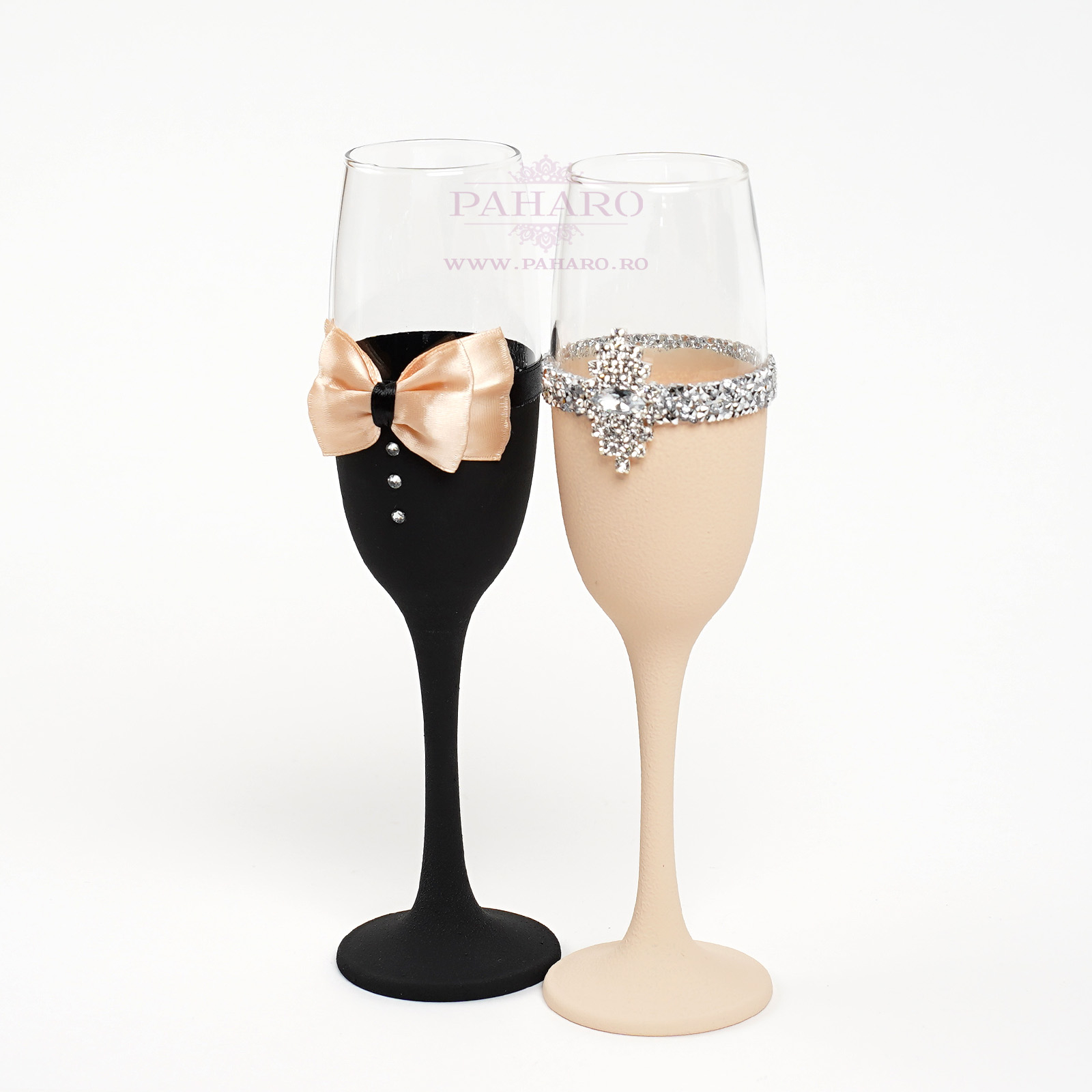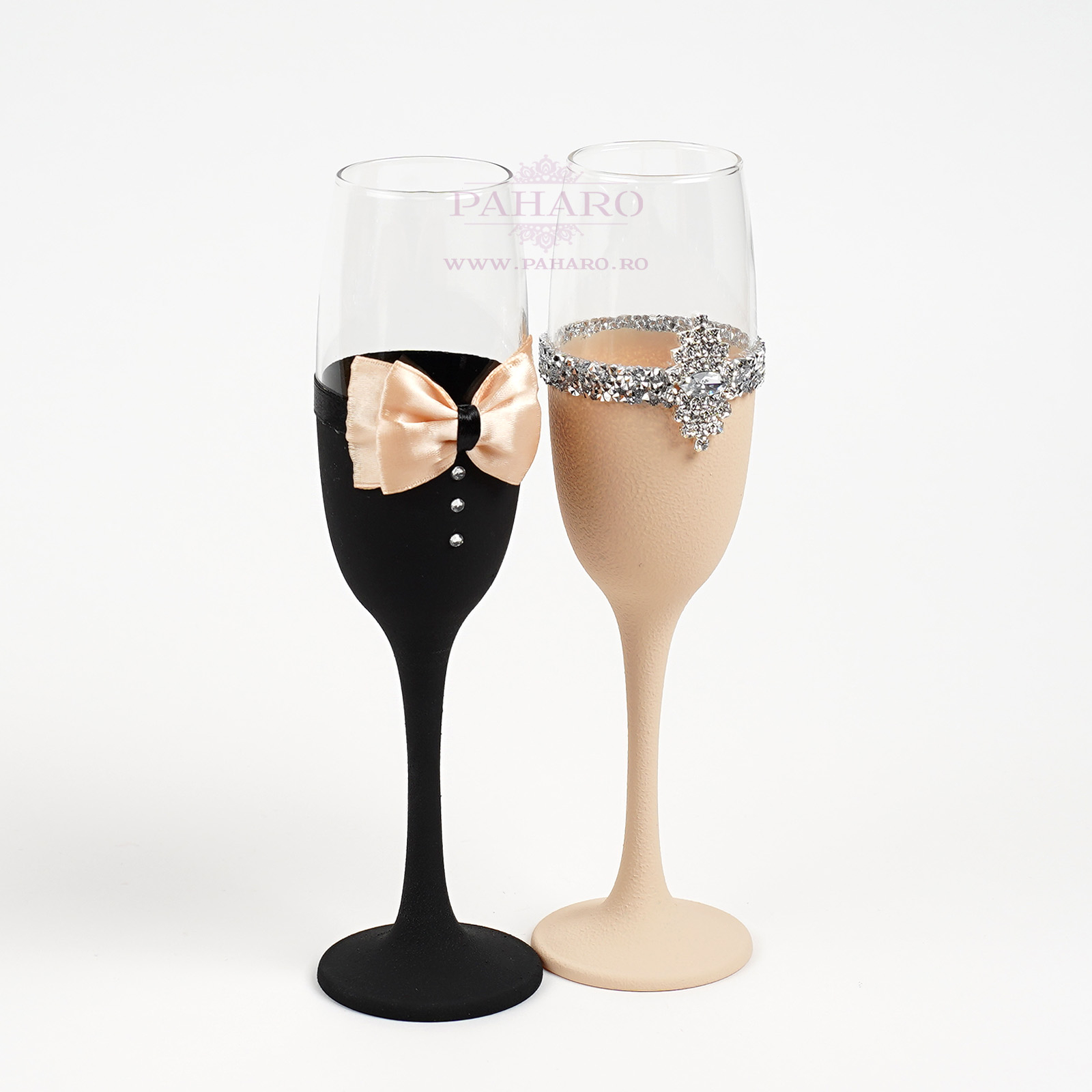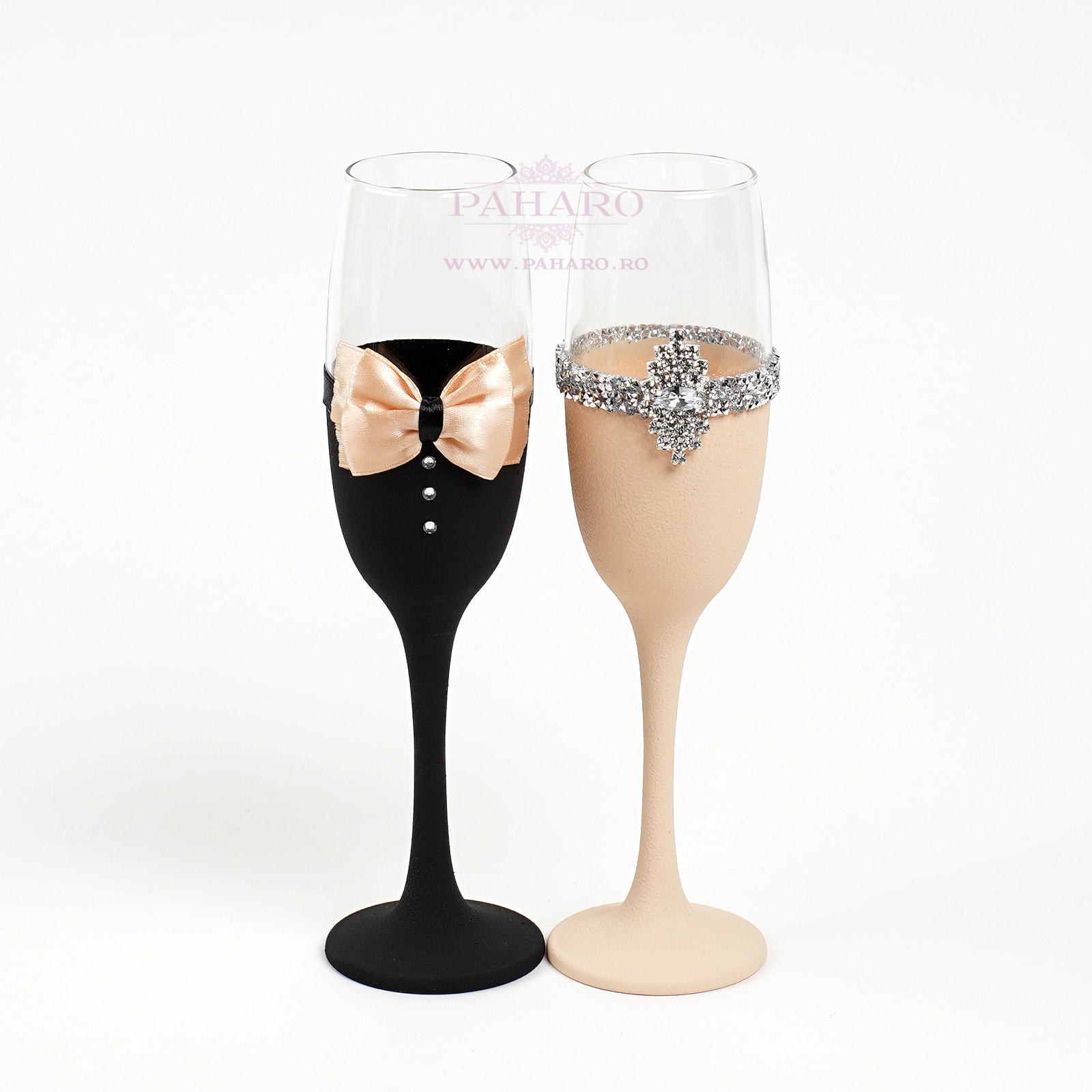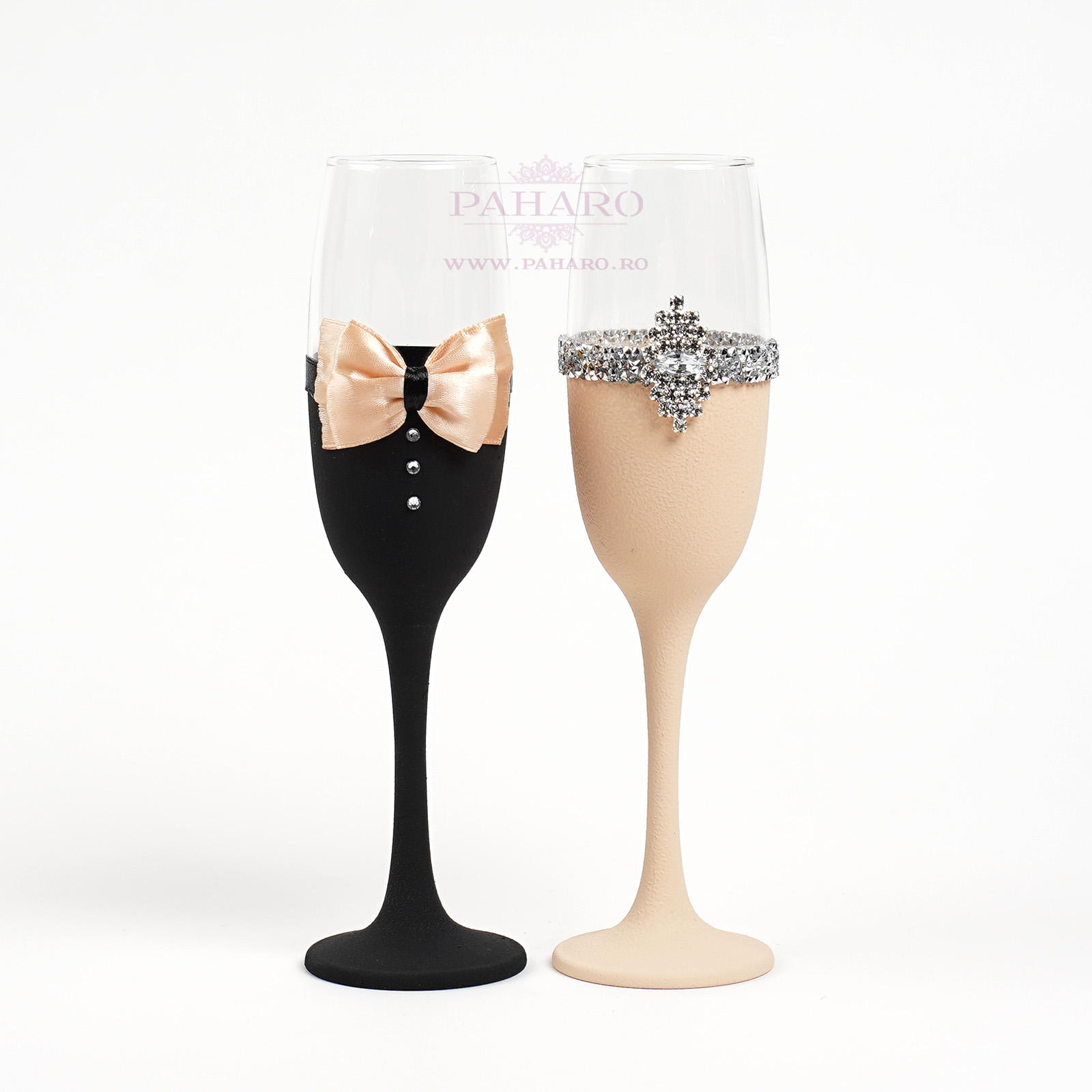 Paharul pentru domni: vopsit în negru mat, acest pahar evocă rafinamentul unui smoching clasic. Decorat cu un papion din satin și detalii din cristale care evidențiază nasturii de cămașă, acesta este perfect pentru a reprezenta eleganța masculină în ziua evenimentului.