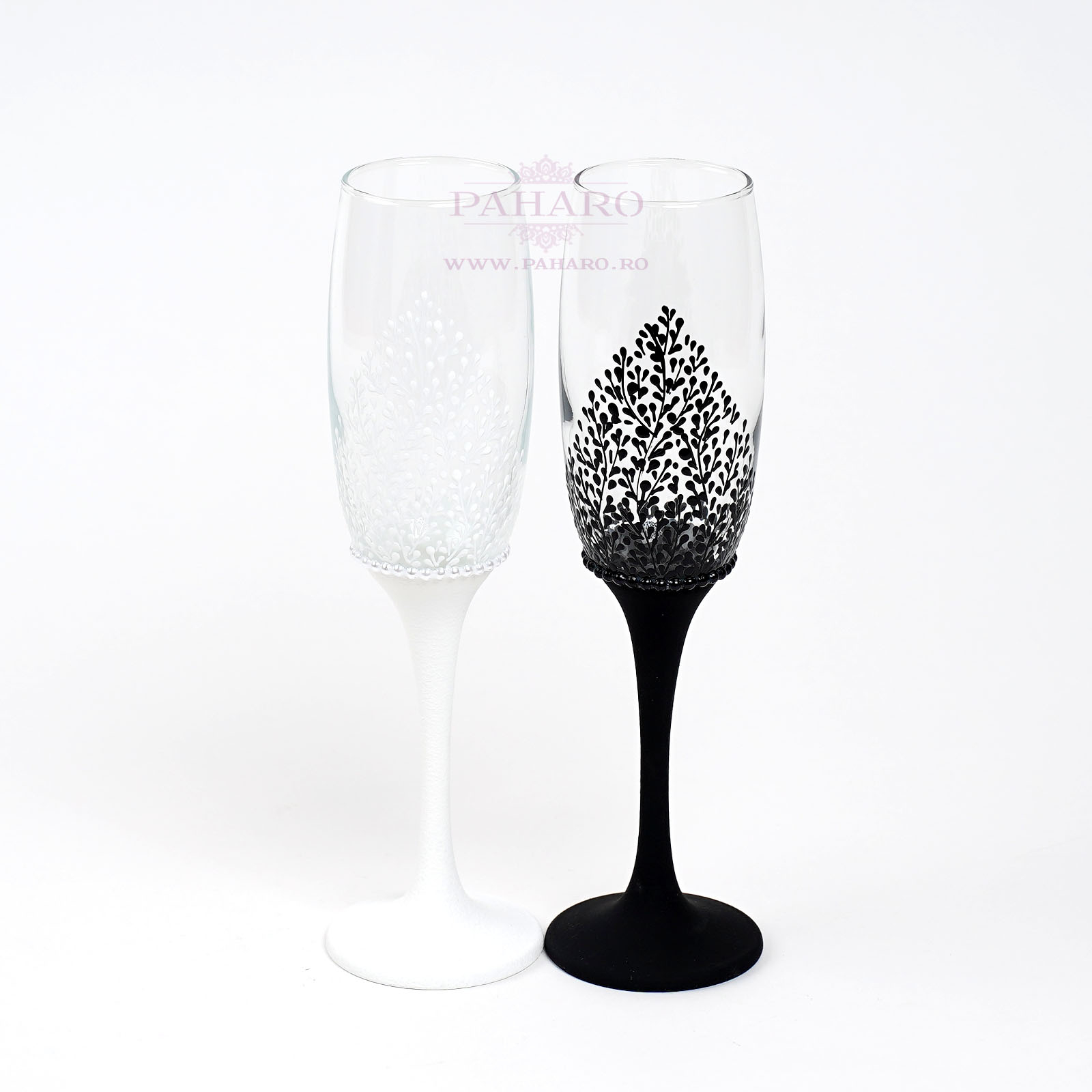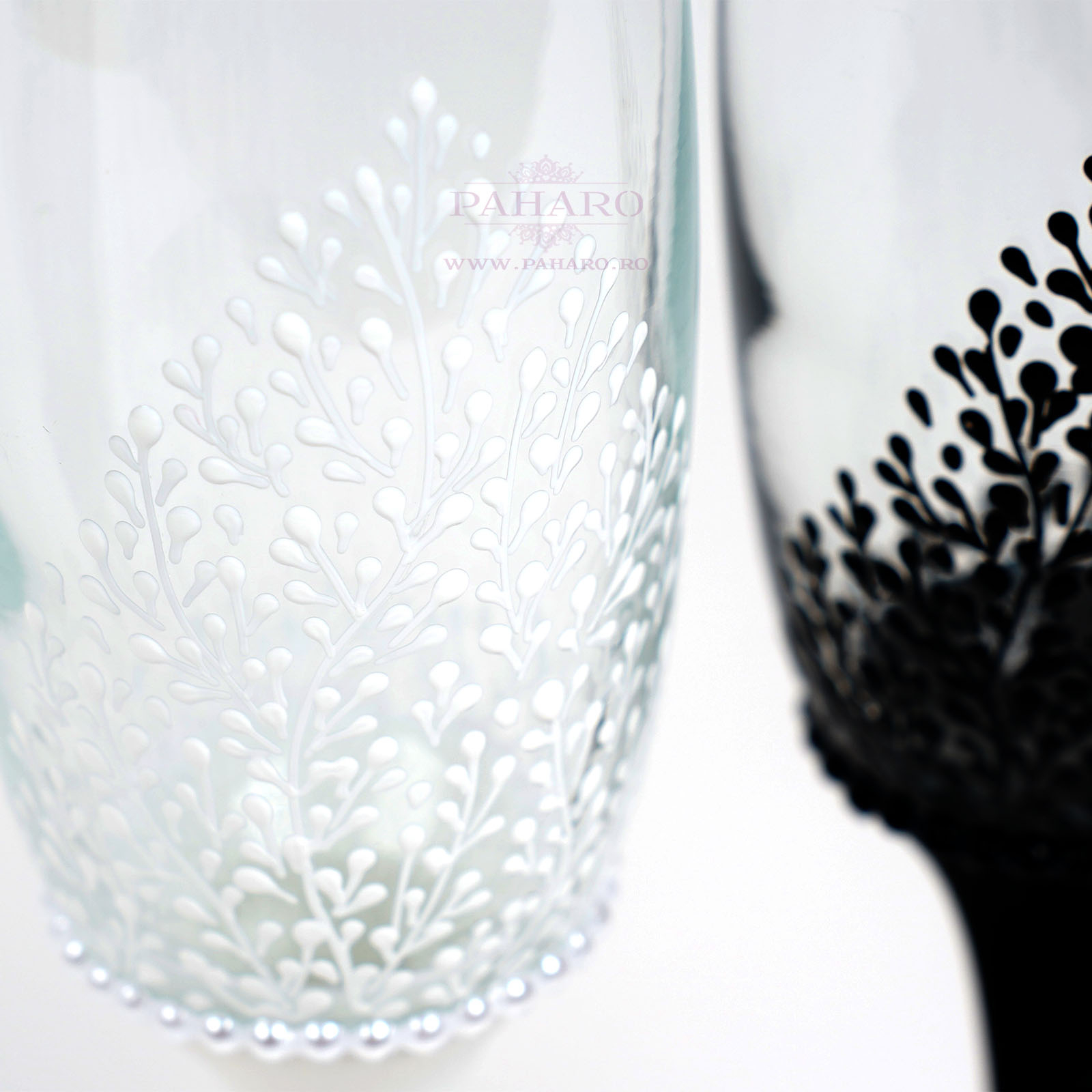 Detalii: Delicat și sofisticat, culoare alb respectiv negru pe baza și piciorul paharului urmat de un contur din perle și un design sub formă de ramificații orientat catre varful cupei oferind un aspect delicat și de efect.