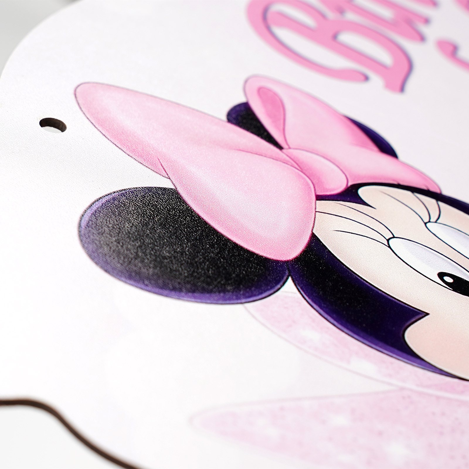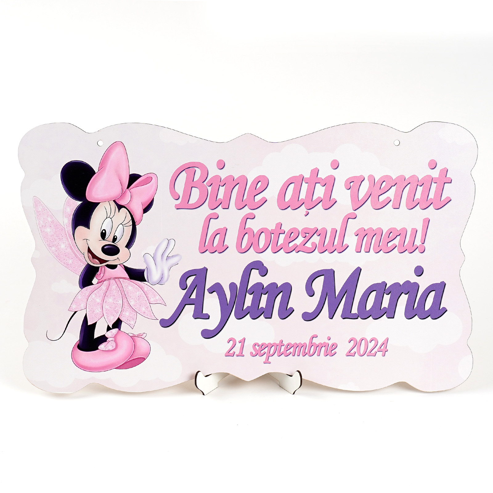 Bucurați-vă de un decor vesel și colorat pentru evenimentul special al micuței voastre! Această placă decorativă, cu un design adorabil Minnie Mouse, este perfectă pentru a întâmpina oaspeții la evenimentul micuței botezate.